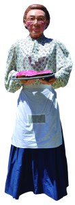 La geganta a les mans porta un plat amb dues llesques de pa amb tomàquet i pernil, que representa el berenar que cada tarda l’àvia preparava al seu net, Sergi Iglesias, president i creador de la Colla Gegantera “La Pessigolla”.